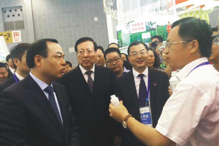 成都市農委總農藝師姚光貴向成都市委唐書(shū)記介紹可以喝的太抗生物農藥(2016年創(chuàng )交會(huì ))