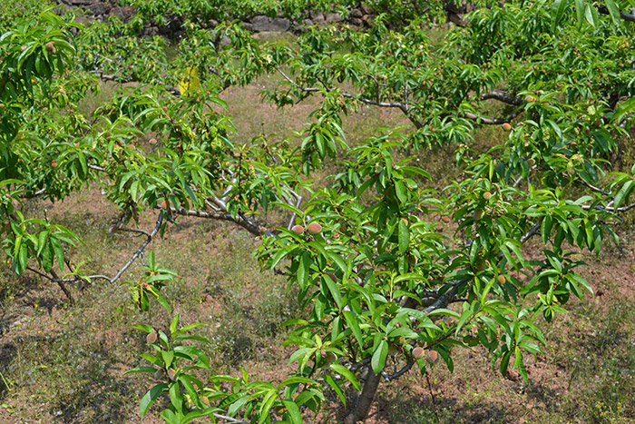 常規處理的對照桃樹(shù) – 枝葉稀疏,桃葉卷曲